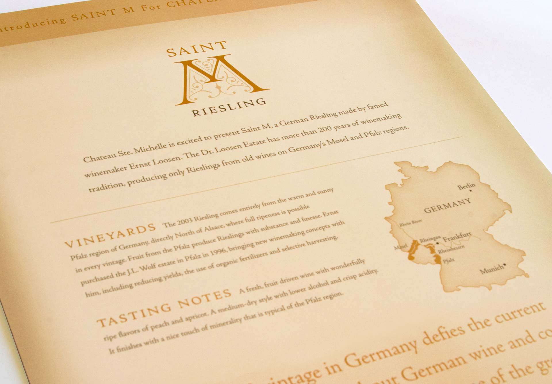 Packaging, collateral and point of sale design for joint venture between Chateau Ste. Michelle and German winemaker Dr. Ernst Loosen.